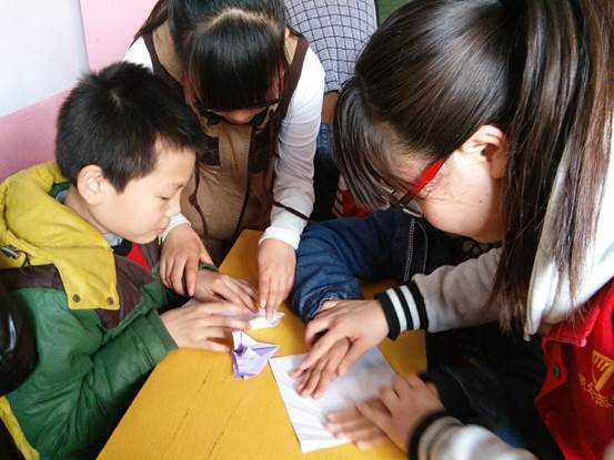 下午两点半,15名志愿者抵达蓝天残疾儿童康复中心,意外的是教室门居然是关着的,轻扣房门,一张天使般的面孔从门后闪现,是一个热情洋溢的孩子,随之而来的便是其他孩子们热烈的欢呼声,开门的孩子把站在门口的志愿者拉进去,迫不及待地想要跟志愿者玩耍。接下来,在老师的安排下,志愿者被分成两个小组帮助孩子们进行康复训练。一个小组陪孩子们做游戏、教他们折纸,另一个小组帮助工作人员给孩子们做一些按摩和康复训练,志愿者看着孩子们在努力地进行康复训练,感到十分欣慰。就这样,志愿者和孩子们一起度过了一个快乐幸福的下午。欢乐的时光总是短暂的,又到下午五点离别时,在孩子们恋恋不舍的目光中,志愿者还是挥手告别,结束了这次爱心活动。